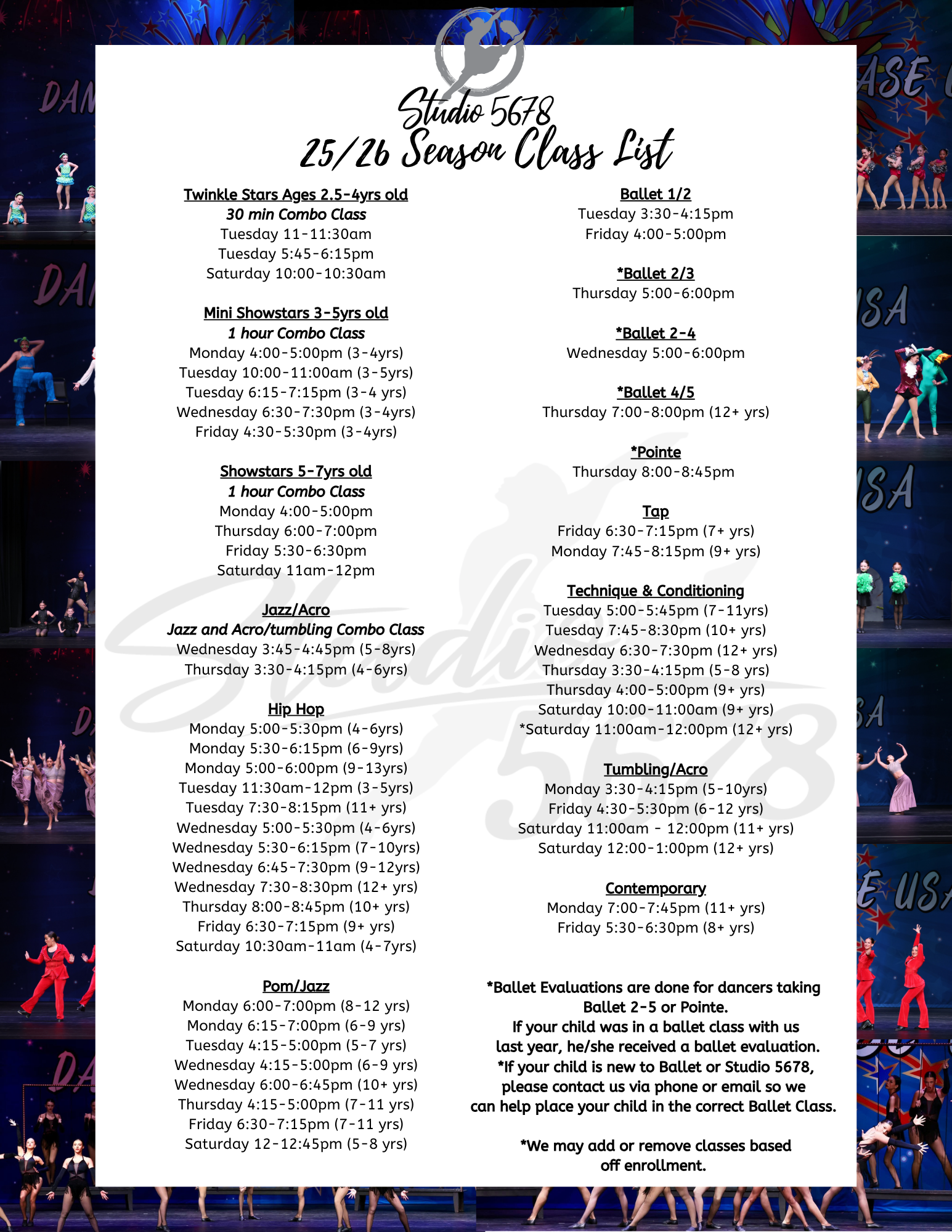 Experience the joy of movement at Studio 5-6-7-8! Now celebrating 22 years of excellence in dance and tumbling, we offer a creative, professional environment where technique meets performance. From your first trial class to our competitive stages, we foster self-confidence, discipline, and mutual respect in every student